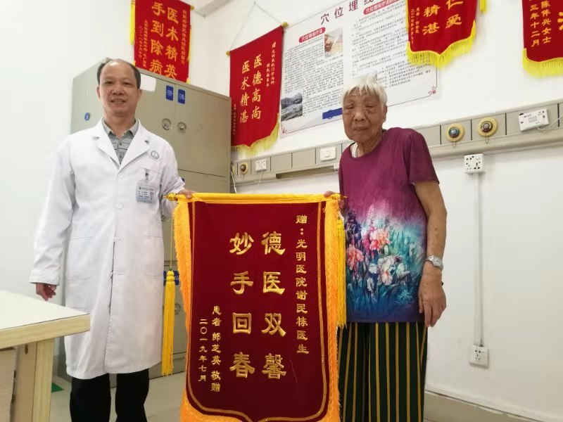 近日,中医科谢民栋主任收到患者郎大妈送来的锦旗。郎大妈今年82岁,既往有心脏病、高血压、高血脂、脑梗塞病史,14天前刚从其他医院出院,颜面及左上肢就出现严重水肿,眼睛都睁不开,并且食欲很差,多方治疗无效,不得不再次入院,治疗效果仍然欠佳,愁坏了家里人。经社康医生介绍,家属抱着试试看的心理来到我院中医科求诊。谢民栋主任医师仔细询问后,经中医四诊合参,认为该病人为脾肾阳虚,阳虚水泛。为她开了3剂中药,患者服用1剂后水肿明显消退,开始有食欲, 3剂中药后水肿好转,饮食恢复如常,家人不胜欢喜,特送锦旗以示感谢。(通讯员 郑智)