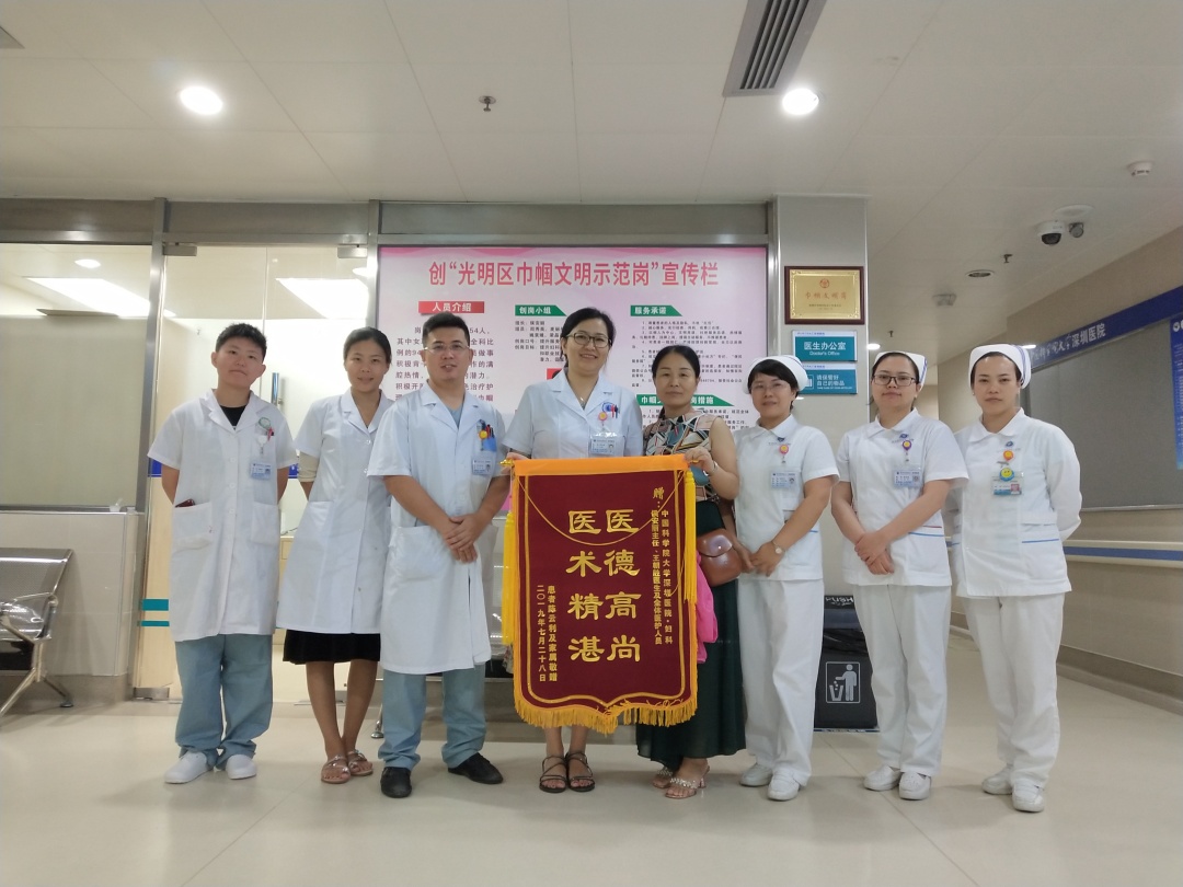 7月28日,第八党支部书记、妇一科主任侯安丽、支委王朝胜收到患者陈女士的锦旗。陈女士在外院体检发现卵巢肿瘤,慕名来到我院妇科,因工作繁忙,想尽快完成手术,尽快回到工作岗位。侯安丽主任了解情况后,安排她住院第一天检查,第二天腹腔镜微创手术,术中几乎无出血,术后第二天就康复出院,整个过程仅用四天,出院后她很快回到了工作岗位!为此,陈女士特地送来锦旗表达谢意!(通讯员 侯安丽)