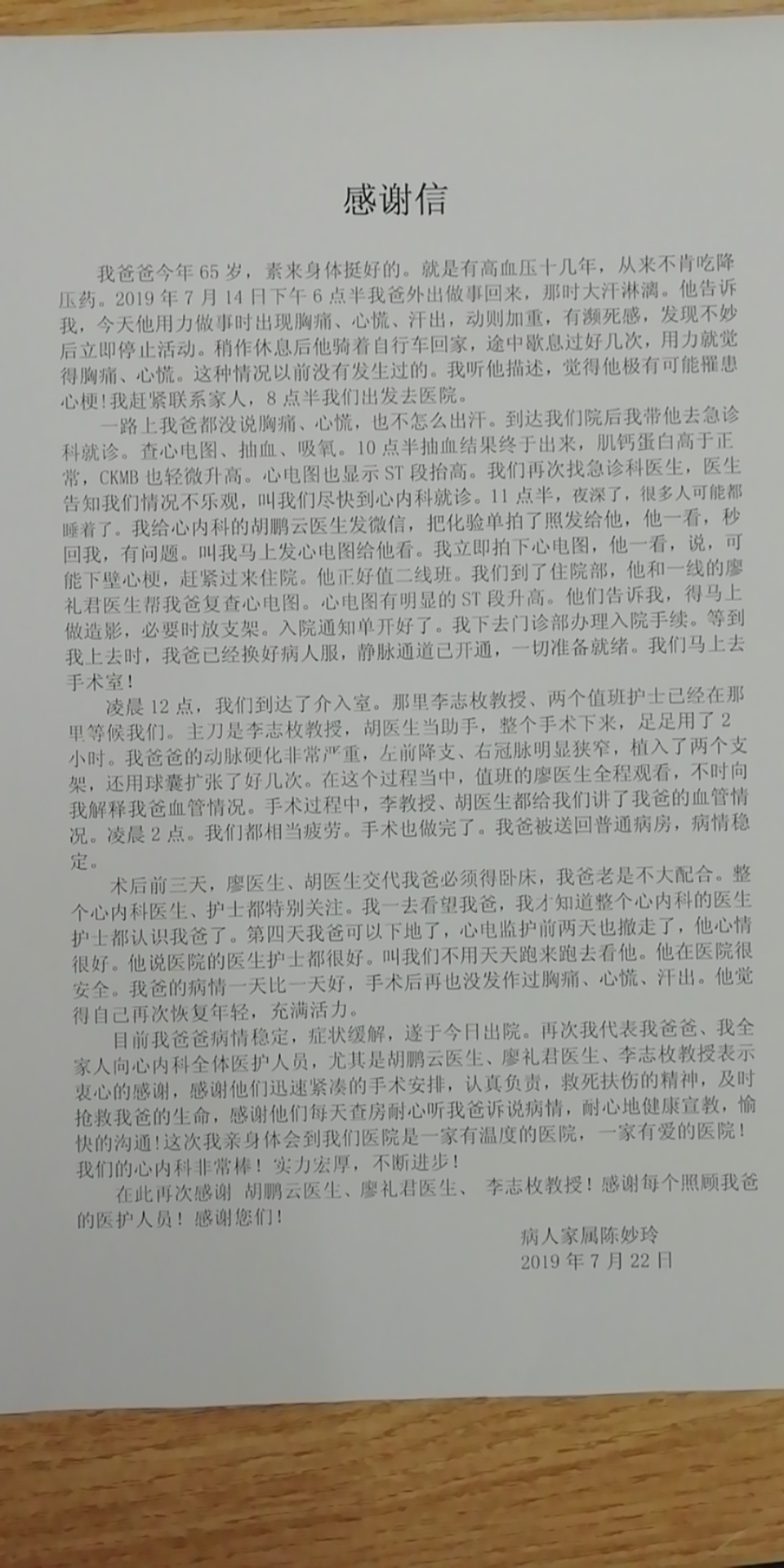 7月22日,患者家属陈妙玲送来一封感谢信,感谢心内科廖礼君医生、胡鹏云医生、李志枚教授迅速及时的手术安排和认真负责、救死扶伤的敬业精神,及时挽救了患者的生命,感谢医护人员耐心告知病情,健康宣教,让患者感受有温度的医疗服务。(通讯员 廖礼君)