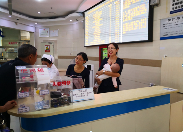 8月26日上午,客服中心徐薇上班时,看到一位妈妈背着又大又沉的背包,手上抱着几个月大的宝宝,她赶忙迎上去询问有什么可以帮忙,这位妈妈说要去看病,徐薇询问是否需要帮忙抱孩子。这位妈妈欣然接受并表示非常感谢。上图为徐薇在服务台抱着宝宝给其他患者提供服务。(通讯员 李丹)