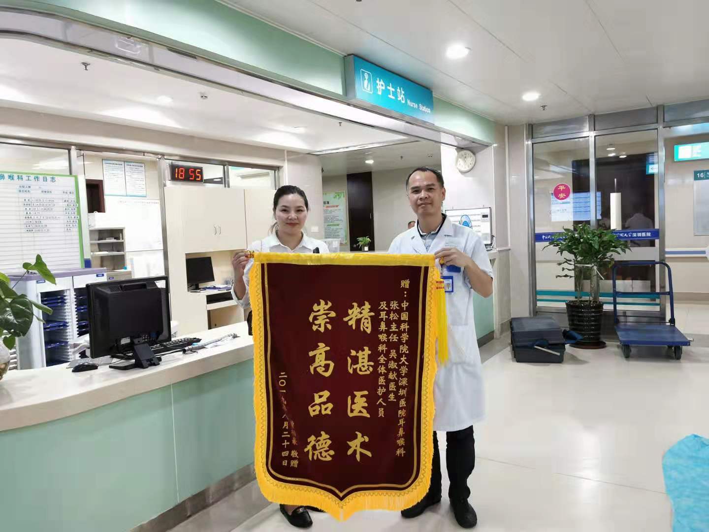 9月17日,第七党支部党员、耳鼻喉科张松主任和吴淑献医生收到患者送来的锦旗。患者曾柏豪小朋友,因睡眠打鼾在耳鼻喉科就诊,检查发现腺样体肥大及双侧扁桃体肥大,收入住院。行全麻下双侧扁桃体及腺样体切除术,术后打鼾症状完全消失了。住院期间,患者受到全体医护人员的热心接待,贴心服务,家属特送锦旗以示感谢。(通讯员 吴淑献)
