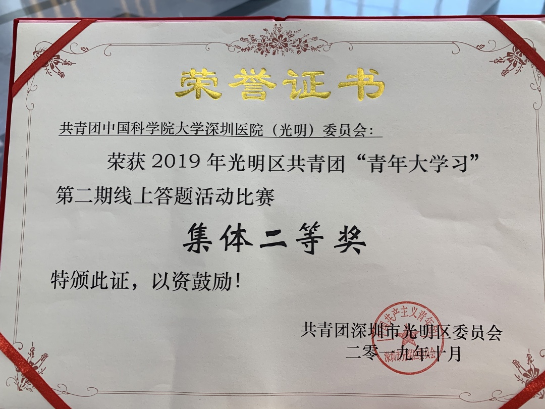 我院团委在共青团深圳市光明委员会举办的“青年大学习”中荣获集体二等奖(全区共50多个基层团组织参赛)。我院青年王文娟、邓海镖、许艳贞获个人三等奖;朱艳玲、余海媚、张秋莲、罗艺淇获个人优秀奖。(通讯员 许艳贞)