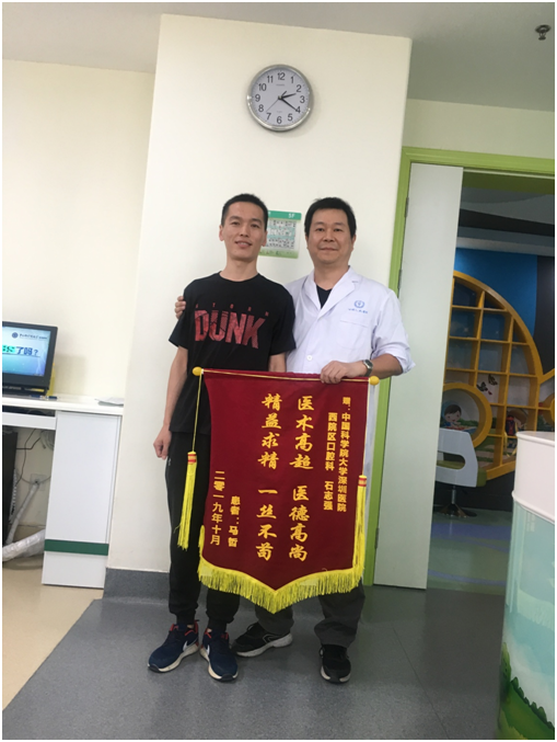 10月22日,第七党支部党员、口腔科石志强医生收到患者马先生赠送的锦旗。1年以前,马先生因牙列不齐看了好几家医院,医生们都觉得矫正难度大、治疗效果不好,委婉拒绝治疗。听说我院口腔科为深圳市“三名工程”,特意来到我院。石医生经过详细检查,给患者设计系列治疗方案,经过一年多时间精心治疗,矫治效果很好,患者非常满意,特送来锦旗表示感谢。(通讯员 唐世平)