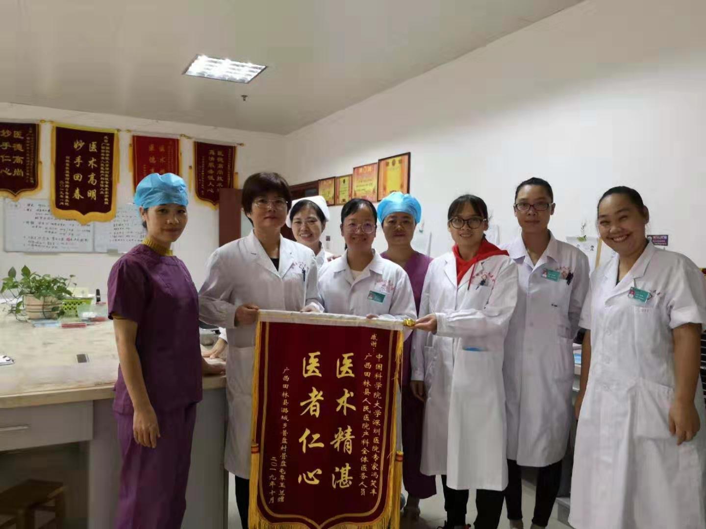 10月19日,我院驻田林县人民医院帮扶医疗专家冯笑丰主任医师成功抢救了一例羊水栓塞病人,患者康复出院后送来了一面锦旗,以表谢意。(通讯员 黎海涛)