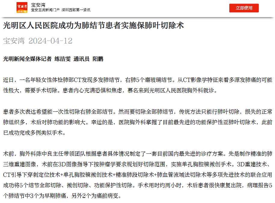 宝安湾|:光明区人民医院成功为肺结节患者实施保肺叶切除术