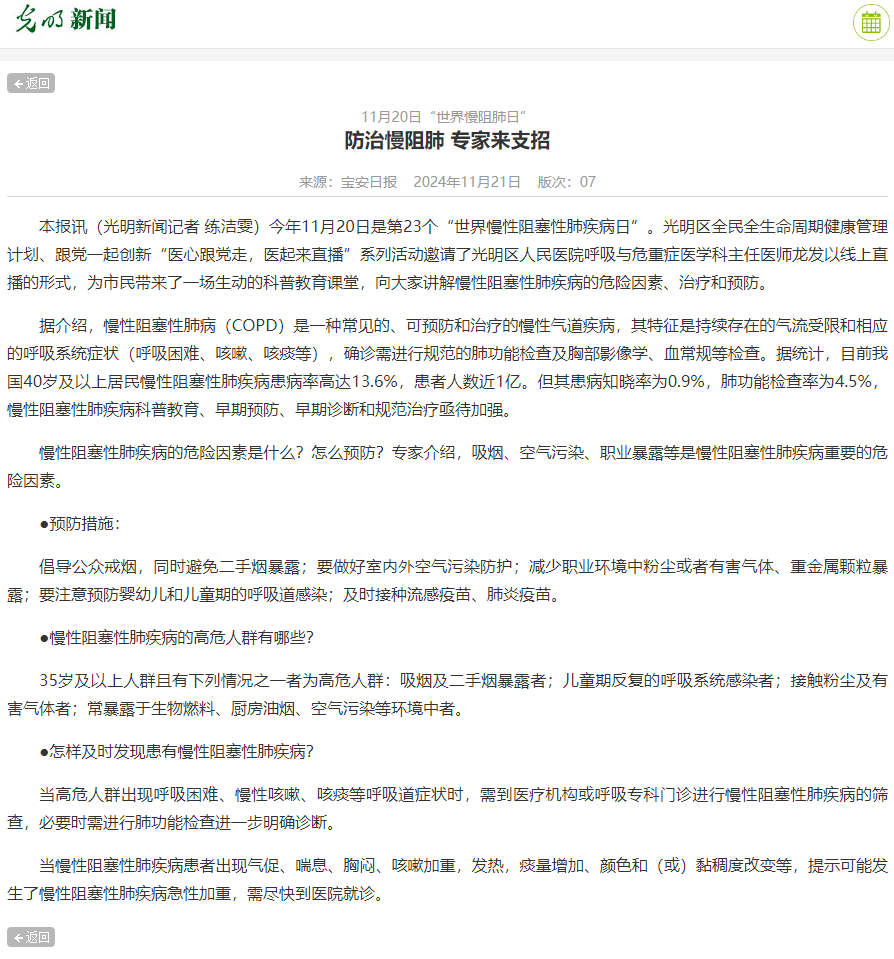 光明新闻:11月20日“世界慢阻肺日” 防治慢阻肺 专家来支招