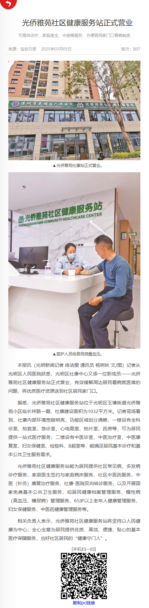 宝安日报:光侨雅苑社区健康服务站正式营业 可提供诊疗、家庭医生、中医等服务,方便居民家门口看病就医